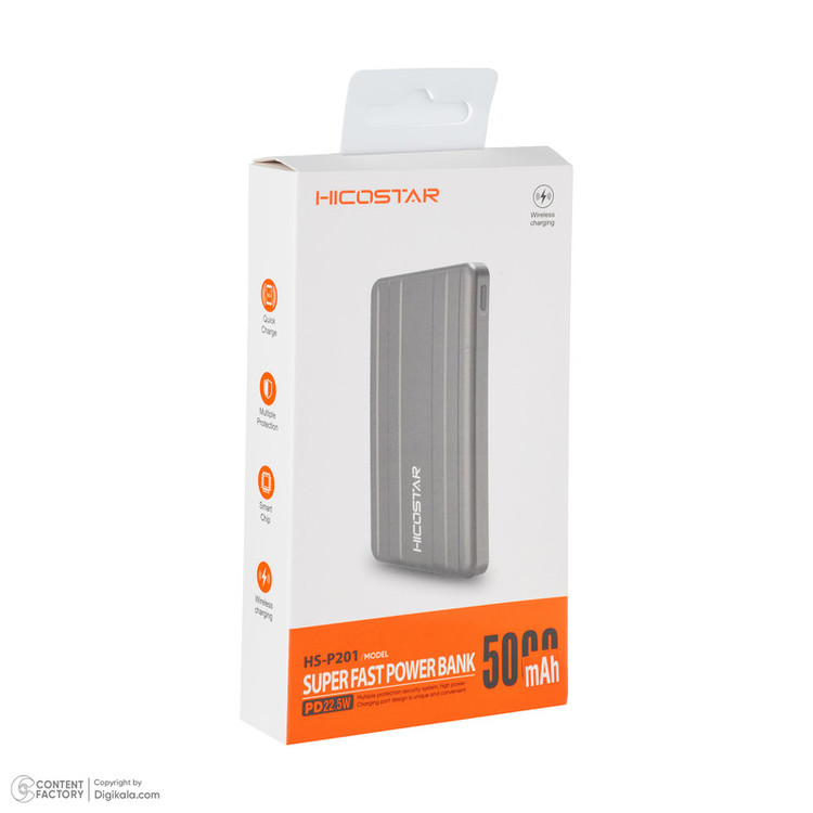 پاوربانک HICOSTAR مدل HS_P201 با ظرفیت ۵۰۰۰ میلیآمپر ساعت، ترکیبی از طراحی سبک، شارژ سریع و فناوریهای هوشمند است. این پاوربانک از شارژ بیسیم (Wireless Charging) پشتیبانی میکند و به شما این امکان را میدهد تا بدون نیاز به کابل، گوشی خود را بهراحتی شارژ کنید. همچنین به لطف تراشه هوشمند (Smart Chip)، عملکرد دستگاه بهینه شده و بهطور خودکار شدت جریان و ولتاژ مورد نیاز هر دستگاه را تنظیم میکند تا شارژی ایمن و کارآمد داشته باشید. پشتیبانی از فناوری PD با توان ۲۲.۵ وات باعث شده تا سرعت شارژ این مدل نسبت به بسیاری از پاوربانکهای همرده بالاتر باشد. از طرفی، وجود سیستم محافظتی چندگانه خیال شما را از بابت امنیت در برابر نوسانات برق، داغ شدن یا شارژ بیش از حد راحت میکند. در مجموع، HS_P201 انتخابی مناسب برای کسانی است که بهدنبال یک پاوربانک هوشمند، سریع و قابل حمل هستند و میخواهند در هر شرایطی، حتی بدون کابل، دستگاه خود را شارژ کنند.